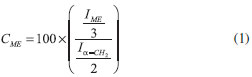 IME é o valor da integral do sinal do éster metílico e Iα-CH2 é o valor da integral do grupo metileno adjacente ao grupo éster. Assim, a integral do éster metílico foi dividida pelo fator 3 e a integral do grupo metileno foi dividida pelo fator 2, uma vez que o éster metílico tem três hidrogênios em cada sinal -OCH3 em 3,6 ppm e dois hidrogênios do sinal referente ao grupo metileno adjacente a carbonila (α-CH2) em 2,3 ppm.10