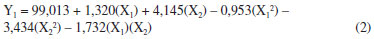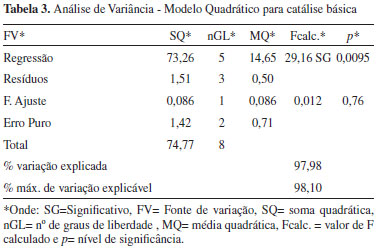Além dos gráficos de probabilidade normal, os resultados dos experimentos realizados com base nos planejamentos Doehlert, como a conversão em ésteres metílicos (%) determinada a partir do RMN 1H, possibilitam também gerar uma superfície de resposta, que está apresentada na Figura 6. Foram testados modelos lineares e quadráticos, porém, apesar de ambos os modelos apresentarem homocedasticidade para os resíduos e uma regressão significativa com uma falta de ajuste não significativa, o modelo linear apresentou, para a catálise básica, um percentual de variância explicada somente de 78,95%. Desta forma, o modelo quadrático foi escolhido por representar melhor o comportamento dos dados e a função matemática ajustada para a catálise básica é apresentada na equação 2 gerando a superfície de resposta mostrada na Figura 6. Para esta equação foi obtida uma variância explicada de aproximadamente 98%. Para ambos os modelos foi considerado um nível de significância de 0,05, sendo os resultados da análise da variância apresentados na tabela 3. ![]()