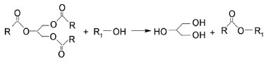 ![]() Figura 2. Esquema representativo da reação geral de transesterificação do óleo de soja com álcool primário (metanol) produzindo biodiesel e glicerol como subproduto