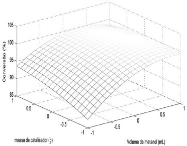 Como pode ser observado na Figura 6, o resultado obtido para a superfície de resposta confirma os resultados obtidos tanto experimentalmente quanto no gráfico de probabilidade normal (Figura 5), ou seja, a maior influência do volume de metanol no aumento da conversão da etapa básica da reação de transesterificação em relação à massa de catalisador.
