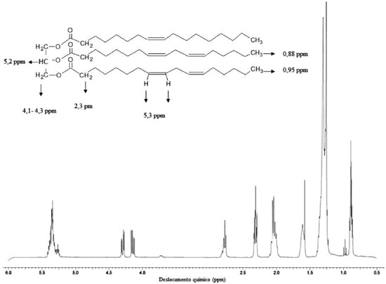 Figura 4. Espectro de RMN de 1H de biodiesel de óleo de soja produzido pelo método TDSP (experimento 2 da etapa 1)