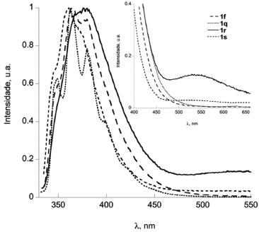 ![]() Figura 7. Espectros de fluorescência normalizado de 1f, 1q, 1r e 1s em acetonitrila (λexc= 300 nm; A300nm=0,1). Anexo - espectros em comprimento de onda mais longos