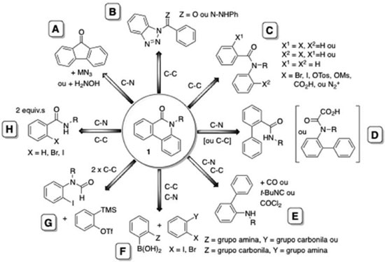 As metodologias para a síntese de fenantridinonas (1) têm se diversificado, além dos métodos clássicos, com o desenvolvimento de métodos empregando catálise por sais de paládio e geração de radicais livres por organocatálise. A Figura 2 ilustra de forma genérica as principais abordagens para a síntese de 1.