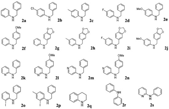 Visando investigar a versatilidade da metodologia de arilação direta para a obtenção de fenantridinonas, diversas anilinas e benzaldeídos foram empregados na reação de aminação redutiva para obter as aminas secundárias. As reações foram feitas de forma a promover a condensação da anilina (ou aminopiridina) com o derivado de benzaldeído e em seguida o redutor (NaBH4) foi acrescentado. De forma geral, obteve-se as aminas secundárias com rendimentos bons a excelentes (65 - 99%) e com pureza satisfatória para análise espectroscópica e uso na reação seguinte. Os sistemas piridínicos apresentaram uma menor reatividade frente ao aldeído. Desta forma a reação de condensação com os aldeídos foi feita em tolueno sob refluxo durante 6 h e em seguida NaBH4 foi acrescentado para promover a reação de redução. Os procedimentos são detalhados no material suplementar. A Figura 3 mostra as aminas secundárias que foram empregadas na síntese das amidas terciárias.