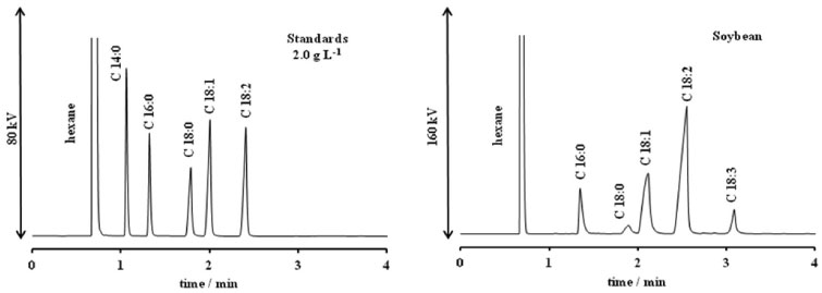 One of the most used methods for fatty acid methyl esters (FAMEs) analysis in biodiesel samples is GC-FID, but some works showed that using conventional columns is not advantageous due the longer time analysis. Pauls13 described a conventional method using a 100 m column containing a biscyanopropyl phase, with programmed oven temperature from 100 to 240 ºC and Ragonese et al.14 optimized a method for the analysis of a soybean FAMEs B20 sample, using a liquid ionic stationary phase column of 30 m, operating under programmed oven temperature from 50 to 270 ºC, both in, about, 50 min of analysis time. Within this context, the present work has as aim to demonstrate an alternative method able to perform fast analysis of majority FAMEs in biodiesel samples obtained through the basic or acidity catalysis transesterification reaction of vegetable oils such as soybean, canola, corn, sunflower and those used in frying process by fast GC-FID using an ionic-liquid as stationary-phase column.
