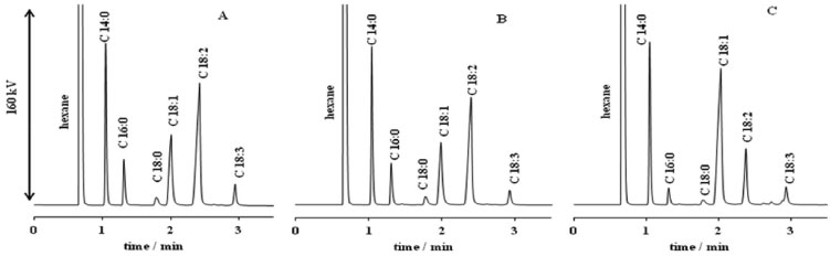 Figure 4. Biodiesel samples chromatograms. A - soybean biodiesel. B - frying processes oil biodiesel. C - canola biodiesel (the others samples chromatograms are analogous to the showed in this figure). Peaks: C 14:0 - methyl myristate; C 16:0 - methyl palmitate; C 18:0 - methyl stearate; C 18:1 - methyl oleate; C 18:2 - methyl linoleate; C 18:3 - methyl linoleneate