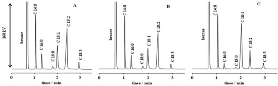 CONCLUSION Fast GC-FID analysis using the column containing an ionic-liquid stationary phase could process a larger number of replicates in a shorter time, decreasing the consumption of energy, the volume of carrier and combustion gases and, consequently, the cost per sample. In addition, individual FAME determination is important for biodiesel quality owing to the oxidation tendency, depending on the unsaturated FAME concentrations. On the other hand, as the method was set in isothermal mode, resulting in increases of the throughput, which is very interesting for quality control in routine analysis.