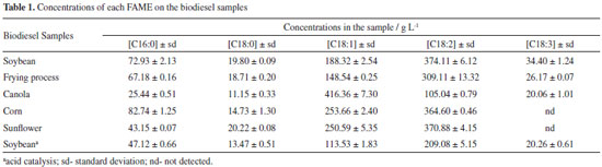RESULTS AND DISCUSSION GC-FID Method consideration For FAMEs analysis in the biodiesel samples obtained from the transesterification of vegetable oils (soybean, canola, sunflower, corn and from frying processes), a fast GC-FID alternative method, with a high-polarity ionic-liquid stationary-phase column, was proposed. Thus, the method was based on the work of Ragonese et al.,14 which presented the separation of FAMEs and hydrocarbons in a B20 sample. However, the application of a temperature program (50-270 ºC, at 70 ºC min-1) was necessary for better separation of the FAMEs and hydrocarbons. Besides, the Ragonese's paper did not describe the use of the column for analysis of pure biodiesel. In the practice point of view, it is important to highlight that the liquid ionic stationary phase column can suffer hydrolysis in presence of low amount of water. Thus, the investigation about the performance of this column in presence of pure biodiesel, which is submitted to water wash after the reaction could be a motivation to investigate the behaviour of the ionic liquid column, since our acknowledgment no report was found in the literature. Besides, in the present work, for B100 analysis it is not necessary to use of temperature program; thus, a 160 ºC isotherm was used, which resulted in an analytical throughput improvement, as it is not necessary to wait for the oven to cool between successive analyses. Once C14:0 is present lower than 0.5% m/m in real samples, it was used as an internal standard.16 Thus, as observed in Figure 3, C14:0 was not detected in the real sample and it could be used as an internal standard at a fixed concentration of 2.0 g L-1.