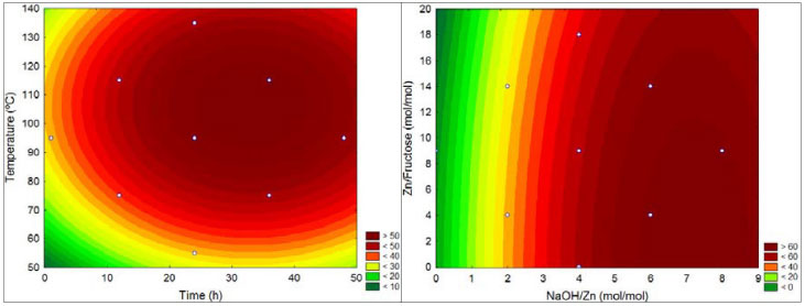Under the same magnification, Figures 1a and 1c show the difference in the amount of solid deposited in samples 17 (5% degradation achieved) and 22 (25% degradation achieved), respectively. At higher magnifications, Figures 1b and 1c, different morphologies of the samples can be observed. For experimental condition 17, there are small agglomerates of spheres composed by rods, whereas experiment 22 presents a larger amount of irregular formations. When comparing the photocatalytic activity of the above-mentioned samples, an increase in the amount of solid and the rod structures can be associated with higher RhB degradation. Zinc plates results By analyzing the zinc plates results obtained by Statistica software using ANOVA, a relatively low correlation coefficient of around 0.8 was observed, indicating that the model is not predictive of the experimental data, and a pure error of 12 was obtained. The analysis indicated no interactions between the variables, and the most significant variable was the molar ratio NaOH / Zn, since it presents significant quadratic and linear coefficients. However, in Figure 2, the contour plots of the results for the zinc substrate indicated a tendency in the behavior of the variables. As the observation indicates, the higher the NaOH/Zn molar ratio the higher the dye degradation. This was the same behavior presented by the fructose. As the Zn/fructose molar ratio decreases, meaning an increase in the fructose concentration in the system, the degradation increases.