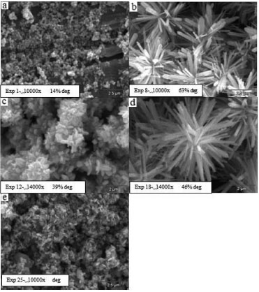 For the copper plate substrate, better ordination of the structures provides higher dye degradation. Experiments 8 and 18, figures 5b and 5d respectively, presented an ordered array, while experiment 1, figure 5a, presented poor ordination and low dye degradation. XRD characterization To better understand the samples' composition, the phase purity and crystallographic structure of the white powder deposited at the bottom of the autoclaves after the hydrothermal reaction were determined by XRD analysis. All peaks can be indexed to hexagonal wurtzite-structured ZnO, consistent with the standard data (JCPDS Card No. 65-3411). Some of the results of the experimental design of zinc plate substrates are shown in Figure 6.