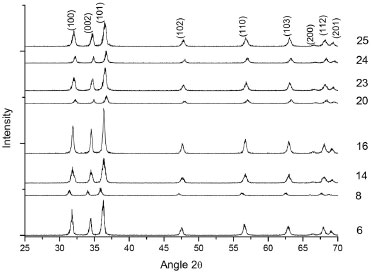 ![]() Figure 6. XRD patterns of the obtained samples (powder at the bottom of the autoclave for zinc substrates). The numbers in the Figure refer to the experiments