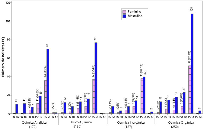 RESULTADOS E DISCUSSÃO Distribuição dos bolsistas PQ por subárea, categorias de bolsa e gênero. A Figura 1 apresenta a distribuição dos bolsistas PQ de acordo com o sexo, nível e subárea. Em março de 2013 o Programa Básico de Química possuía 727 bolsistas PQ, sendo 262 na categoria PQ-1, 458 na categoria PQ-2 e 7 na categoria PQ-SR.