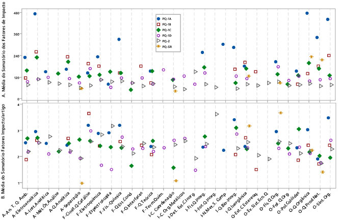 Verificou-se que as Especialidades de Determinação de Estrutura de Compostos Inorgânicos, Não-Metais e Seus Compostos e Termodinâmica Química possuíam valores de mediana e média bem elevados, o que destacou a boa produtividade individual de seus bolsistas. Na análise do número de artigos por ano nas subáreas, verificou-se que na Química Analítica, a Especialidade mais produtiva era a Instrumentação Analítica com mediana de 4,8 artigos/ano, mas a Especialidade com perfil mais homogêneo de produtividade entre seus bolsistas era a Separação. Na Físico-Química, a Especialidade mais produtiva era a Eletroquímica com mediana de 5,1 artigos/ano, mas a Especialidade com perfil mais homogêneo de produtividade entre seus bolsistas era a Química de Interfaces. Na Química Inorgânica, a Especialidade mais produtiva, em número de artigos, era a Determinação de Estrutura de Compostos Inorgânicos, com mediana de 6,6 artigos/ano, mas a Especialidade com perfil mais homogêneo de produtividade entre seus bolsistas era a Fotoquímica Inorgânica. Na Química Orgânica, a Especialidade mais produtiva era a Físico-Química Orgânica com mediana 4,8 artigos/ano, mas a Especialidade com perfil mais homogêneo de produtividade entre seus bolsistas era a Fotoquímica Orgânica. Em quase todas as Especialidades o valor da média era superior ao valor da mediana, pois bolsistas muito produtivos favoreciam a elevação da média. Excepcionalmente, nas Especialidades Instrumentação Analítica e Eletroquímica, existiam bolsistas com produtividade bem menor que a dos demais, o que deslocou a média para valores abaixo das respectivas medianas. Na análise do número de artigos publicados, nos 10 anos estudados, por categoria de bolsa PQ (dados não mostrados) a Especialidade no nível PQ-1A com maior produtividade era a Química de Produtos Naturais com mediana de 16,5 artigos/ano e a menos produtiva era a Espectroscopia com mediana 2,7 artigos/ano. No nível PQ-1B, a mais produtiva era a Estrutura, Conformação e Estereoquímica com mediana de 11,9 artigos/ano e a menos produtiva era a Química Teórica com mediana 4,1 artigos/ano. No nível PQ-1C, a mais produtiva era a "Especialidade"-Química Orgânica com mediana 10,2 artigos/ano e a menos produtiva era a Química Bioinorgânica com mediana 2,8 artigos/ano. No nível PQ-1D, a mais produtiva era a Físico-Química Orgânica com mediana de 7,8 artigos/ano e a menos produtiva era a Química Teórica com mediana 3,5 artigos/ano. No nível PQ-2, a mais produtiva era a Determinação de Estrutura de Compostos Inorgânicos com mediana de 7,6 artigos/ano e a menos produtiva era a Fotoquímica Inorgânica com mediana 1,7 artigos/ano. No nível PQ-SR, a mais produtiva era a Química de Produtos Naturais com mediana de 15,3 artigos/ano e a menos produtiva era a Físico-Química Orgânica com mediana 2,3 artigos/ano. Entre todos os bolsistas PQ da área de Química, os dois pesquisadores com os maiores números de artigos publicados, em 10 anos, da área de Química, foram um pesquisador da "Especialidade"-Química Orgânica com 334 artigos e uma pesquisadora da Química de Produtos Naturais com 218 artigos. Somatório dos fatores de impacto Um outro critério utilizado pelo CA-QU nos julgamentos de bolsa é a análise do Somatório dos Fatores de Impacto dos periódicos (ΣFI) em que o pesquisador publicou, no período. Na análise da média do ΣFI das revistas em cada Especialidade no período de 10 anos, verificou-se que as Especialidades com os maiores valores de média de ΣFI eram a Eletroanalítica com média de 145,1 (DP=95,6) e a "Especialidade- Química Orgânica com 135,3 (DP=162,9). O CA-QU em seus critérios 2012-2014,10 e mantido para 2015-2017,11 estabeleceu que o valor mínimo de ΣFI para os pesquisadores PQ-1 deveria ser igual a 40, em um período de 10 anos de produtividade, e para os bolsistas PQ-2, o valor mínimo igual a 10, em 05 anos de produtividade. Na apreciação dos valores mínimos de ΣFI em cada uma das Especialidades da Química (dados não mostrados), verificou-se que três pesquisadores PQ-1D não atingiram esse critério mínimo, sendo estes das Especialidades Química de Produtos Naturais com ΣFI=23,1, Espectroscopia com ΣFI=29,1 e Análise de Traços e Química Ambiental com ΣFI=39,3. Em todas as demais Especialidades da Química, o ΣFI era superior a 43,8 para os bolsistas da categoria PQ-1. Esta mesma análise, para os bolsistas da categoria PQ-2, revelou que o menor valor de ΣFI nesta categoria, considerando-se 10 anos de produtividade, era igual a 23,6 e se referia a um bolsista da Especialidade Cinética Química e Catálise. Na averiguação da produtividade dos bolsistas PQ-2 no período de 5 anos, conforme o critério do CA-QU, foi verificado que 5 bolsistas PQ-2 não possuíam o mínimo estabelecido pelo comitê, sendo 3 da Química Inorgânica, 1 da Físico-Química e 1 da Química Analítica. Esta distorção no cumprimento dos critérios foi corrigido pelo próprio CA-QU em abril de 2013, quando o CNPq convocou os comitês para a reunião de Reclassificação Geral dos Bolsistas PQ. Naquela ocasião o CA-QU alertou os bolsistas da produtividade insuficiente e em 2014 nenhum destes oito pesquisadores permaneceu como bolsista PQ. A Figura 3 apresenta a comparação entre as médias do ΣFI dos artigos (3A) e as médias da razão ΣFI/artigo (3B) nas categorias de bolsa PQ, das Especialidades da Química.