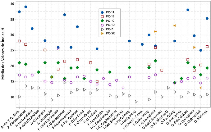 Na análise do Gráfico 3A, verificou-se que os níveis de bolsa mais elevados possuíam, na maioria das Especialidades, os maiores valores de ΣFI e que a Eletroanalítica apresentava os maiores valores médios nos níveis PQ-1A, PQ-1B e PQ-1C. Em algumas Especialidades houve uma inversão da ordem natural esperada, com categorias de bolsa inferiores com valores maiores de média de ΣFI. Isto foi observado na subárea de Química Analítica nas Especialidades Análise de Traço e Química Ambiental, que em média os bolsistas PQ-1C apresentavam valores maiores de ΣFI que os bolsistas PQ-1B e na "Especialidade-Química Analítica, que bolsistas PQ-1B e PQ-1C apresentavam maiores valores de ΣFI que os bolsistas PQ-1A. Na subárea de Físico-Química essa inversão foi observada nas Especialidades Cinética Química e Catálise, em que o nível PQ-1A apresentou a média de ΣFI menor que os níveis PQ-1B e PQ-1D e este último nível apresentou o valor de média maior que PQ-1C; na Espectroscopia, que o nível PQ-1A tinha valor médio de ΣFI menor que PQ-1C e PQ-2; na Química do Estado Condensado, em que o nível PQ-1C tinha valor de ΣFI menor que os níveis PQ-1D e PQ-2 e na Química Teórica, que em relação à média de ΣFI, PQ-1C estava empatado com PQ-1A e acima de PQ-1B, PQ-1D e PQ-2, que também estavam empatados. Na subárea de Química Inorgânica as inversões ocorreram nas Especialidades de Determinação de Estrutura de Compostos Inorgânicos, na qual a média de ΣFI de PQ-2 tinha valor maior que a dos bolsistas PQ-1D; na Química Bio-Inorgânica, que a média de ΣFI de PQ-1D era maior que a de PQ-1C; na "Especialidade"-Química Inorgânica que a média de ΣFI de PQ-1B era maior que PQ-1A. Na subárea de Química Orgânica esse fenômeno se observou na Fotoquímica Orgânica, que em relação à média de ΣFI, o nível PQ-1C estava praticamente empatado com PQ-2 e em valor menor que PQ-1D; na Físico-Química Orgânica que a média de ΣFI de PQ-1D tinha valor maior que a de PQ-1C; na Polímeros e Colóides que o nível PQ-1B tinha valor de média de ΣFI menor que de PQ-1C e PQ-1D; e na "Especialidade"-Química Orgânica que PQ-1B tinha valor de média de ΣFI menor que a de PQ-1C. Em análise do Gráfico 3B, observou-se que algumas inversões foram repetidas quando a média de ΣFI/artigo era comparada. Para uma determinada Especialidade a média de ΣFI estava coerente com o nível, mas se a média de ΣFI/artigo estava invertida em relação aos níveis, atribuiu-se ao fato dos bolsistas daquele nível mais elevado terem publicado mais que os de níveis mais baixos, mas em revistas de menor FI. Isto foi observado, por exemplo, no nível PQ-1A da Especialidade Química de Produtos Naturais. A situação inversa, baixa média de ΣFI, mas alta média de ΣFI/artigo, indicou que o grupo daquele nível publicava menos que os outros demais níveis, mas em revistas de maior FI. Isto se observou, por exemplo, nos PQ-2 da Especialidade Fotoquímica Inorgânica. Entretanto, na Especialidade que o nível de bolsa PQ mais elevado apresentava tanto a média de ΣFI quanto a média de ΣFI/artigo com valores menores, isto significava que, não apenas os pesquisadores daquele nível publicaram menos, mas também em periódicos de menor FI. A análise destes dados indicou que existiam pesquisadores menos produtivos que seus pares na mesma Especialidade, mas classificados em nível mais elevados que esses. Isto se observou, por exemplo no nível PQ-1A da "Especialidade"-Química Analítica, no nível PQ-1B de Polímeros e Colóides e no nível PQ-1C de Química do Estado Condensado. Índice H Um outro indicador de produtividade utilizado pelo CA-QU e considerado um sinalizador da relevância da produção científica do pesquisador é o índice de Hirsch,23 conhecido por índice H. O valor de índice H utilizado no estudo foi o valor informado pelo pesquisador no currículo Lattes e obtido na base ISI Web of Knowledge. Na análise deste indicador em cada subárea, constatou-se que havia um decréscimo no valor de média e mediana do índice H entre os níveis PQ-1A, PQ-1B, PQ-1C, PQ-1D e PQ-2, obedecendo a ordem decrescente na hierarquia das categorias de bolsa. A análise do índice H nas subáreas (dados não mostrados) revelou que na Química Analítica a média e a mediana de índice H, em ordem decrescente, nos níveis de bolsa eram: no nível PQ-1A com média de 31,5 (DP=10,4) e mediana de 33,5 (IQ=21,7-38,2); no nível PQ-1B com média de 25,5 (DP=3,3) e mediana de 27 (IQ=24-28); no nível PQ-1C com média de 19,8 (DP=3,7) e mediana de 19 (IQ=17-22); no nível PQ-SR com média 16,5 (DP=3,5) e mediana de 16,5 (IQ=0); no nível PQ-1D com média de 15,8 (DP=3,7) e mediana de 15 (IQ=12,5-18); e no nível PQ-2 com média de 11,3 (DP=4) e mediana de 11 (IQ=8-14). Na Físico-Química, os valores de média e mediana de índice H eram; no nível PQ-1A com média de 30,6 (DP=9) e mediana de 26 (IQ=24-35,5); no nível PQ-1B com média de 20,5 (DP=3,2) e mediana de 21 (IQ=18,5-22); no nível PQ-1C com média de 19 (DP=2,5) e mediana de 19 (IQ=18-21); no nível PQ-1D com média de 15,9 (DP=3,7) e mediana de 15 (IQ=14-17,5); e no nível PQ-2 com média de 12,5 (DP=3,9) e mediana de 12 (IQ=9-15,5). Na Química Inorgânica, os valores de média e mediana de índice H eram: no nível PQ-SR com média de 31 (DP=0,0) e mediana de 31 (IQ=0); no nível PQ-1A com média de 27,4 (DP=5,4) e mediana de 27 (IQ=22-32); no nível PQ-1B com média de 22,2 (DP=4,5) e mediana de 24 (IQ=18,7-27); no nível PQ-1C com média de 20 (DP=3,6) e mediana de 19,5 (IQ=15-21); no nível PQ-1D com média de 16 (DP=3) e mediana de 16 (IQ=13-19); e no nível PQ-2 com média de 10,4 (DP=3,6) e mediana de 10 (IQ=8-12). Na Química Orgânica, os valores de média e mediana de índice H eram: no nível PQ-1A com média de 30,1 (DP=6,3) e mediana de 31 (IQ=22,7-35,7); no nível PQ-1B com média de 21,7 (DP=4,4) e median
