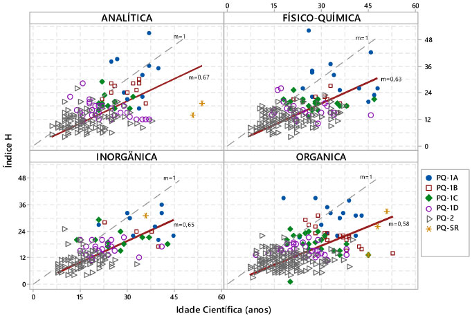 Verificou-se que os valores de média de índice H eram muito diferentes dentro de cada subárea, quando se considerava a Especialidade e as categorias de bolsa. Na análise das subáreas, verificou-se que, na Química Analítica, eram os bolsistas PQ-1A e PQ-1B da Análise de Traços e Química Ambiental e da Eletroanalítica que elevaram a média destes níveis na subárea. Na Físico-Química, para estes mesmos níveis, as Especialidades que elevaram a média do índice H foram a Eletroquímica e a "Especialidade"-Físico-Química. Na Química Inorgânica, as Especialidades responsáveis pela elevação da média foram a Não-Metais e Seus compostos e a Química Bio-Inorgânica. Na Química Orgânica as Especialidades que elevaram as médias nos níveis PQ-1A e PQ-1B foram a de Polímeros e Colóides e a de Síntese Orgânica. Na análise dos menores valores de média de índice H, verificou-se que a Química de Produtos Naturais possuía o menor valor médio de índice H entre os bolsistas PQ-1A, a Química Teórica possuía a menor média entre os bolsistas PQ-1B, a Físico-química Orgânica entre os bolsistas PQ-1C e a Determinação Estrutural de Compostos Inorgânicos entre os bolsistas PQ-1D. Portanto, essas Especialidades deslocaram as médias de índice H para valores mais baixos, nos respectivos níveis de bolsa PQ. Já entre os bolsistas PQ-2 a maior média de índice H era da Eletroquímica e a menor média era da Fotoquímica Inorgânica. Em quase todas as Especialidades, a ordem de média de índice H acompanhava a ordem de hierarquização dos níveis de bolsas, exceto nas Especialidades Química do Estado Condensado, que a média no nível PQ-1D foi superior às médias dos níveis PQ-1B e PQ-1C, e nas Especialidades Química Teórica e "Especialidade"- Química Orgânica em que as médias no nível PQ-1C foram maiores que as médias no PQ-1B. Entre os pesquisadores da categoria PQ-1 a menor média de índice H era da Determinação de Estrutura de Compostos Inorgânicos com valor igual a 13 e entre os pesquisadores da categoria PQ-2, o menor valor de média era 8,5 e estava na Especialidade Fotoquímica Inorgânica. Na apreciação da média de índice H nas subáreas da Química por ANOVA com um fator (α=0,05) verificou-se que todas as 4 subáreas possuíam médias de índice H compatíveis com a média geral da Química (H=14,6). Na apreciação por Especialidades, verificou-se que todas as Especialidades da Química possuíam valores de média, estatisticamente, semelhantes à média geral da área de Química, exceto a Especialidade de Química de Produtos Naturais que possuía média considerada inferior à média geral da área. Este resultado diferenciado, sobre a média do índice H da Especialidade de Química de Produtos Naturais, sugere a necessidade de estudos adicionais que esclareçam se esta situação é uma peculiaridade da Especialidade no mundo ou da Química de Produtos Naturais brasileira. No estudo publicado em 20101 foi apresentado um gráfico relacionando o índice H e a idade científica do pesquisador para verificação do índice m (m=h/tpub) e também foi informado que o índice m, de acordo com Hirsch,23 avalia o sucesso da carreira científica do pesquisador pelo tempo transcorrido desde a publicação de seu primeiro artigo científico (tpub). Para Hirsch, um índice m~1 caracteriza um pesquisador bem sucedido, segundo os padrões do grupo estudado. Índices m~2 caracterizam pesquisadores fora do comum encontrados apenas nas melhores universidades e índice m~3 ou maiores caracterizam indivíduos realmente únicos. Também foi destacado, no artigo de 2010, que são necessárias considerações sobre as avaliações da produtividade de pesquisadores com relação ao índice H, principalmente no que tange às especificidades da subárea de atuação do pesquisador. A Figura 5 apresenta a relação do índice H e a idade científica nos níveis, dentro de cada subárea. A linha tracejada representa o índice m=1 de Hirsch e a linha contínua representa o índice m calculado e ajustado para cada subárea, a partir dos valores de índice m dos bolsistas PQ da subárea.