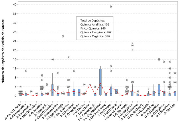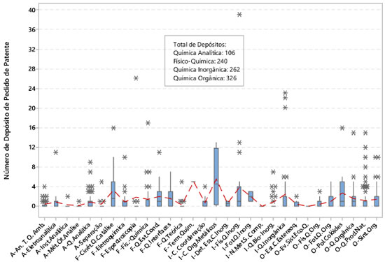 Figura 7. Número de depósito de pedido de patente, referente ao período de 2003 a março de 2013, em cada Especialidade da Química. Os boxplots contêm a informação da mediana, intervalo interquartil, outliers (asteriscos) e a linha tracejada indica a conexão das médias de cada Especialidade da Química. Antecedendo o nome da Especialidade estão as siglas das subáreas: A (Química Analítica), F (Físico-Química), I (Química Inorgânica) e O (Química Orgânica)