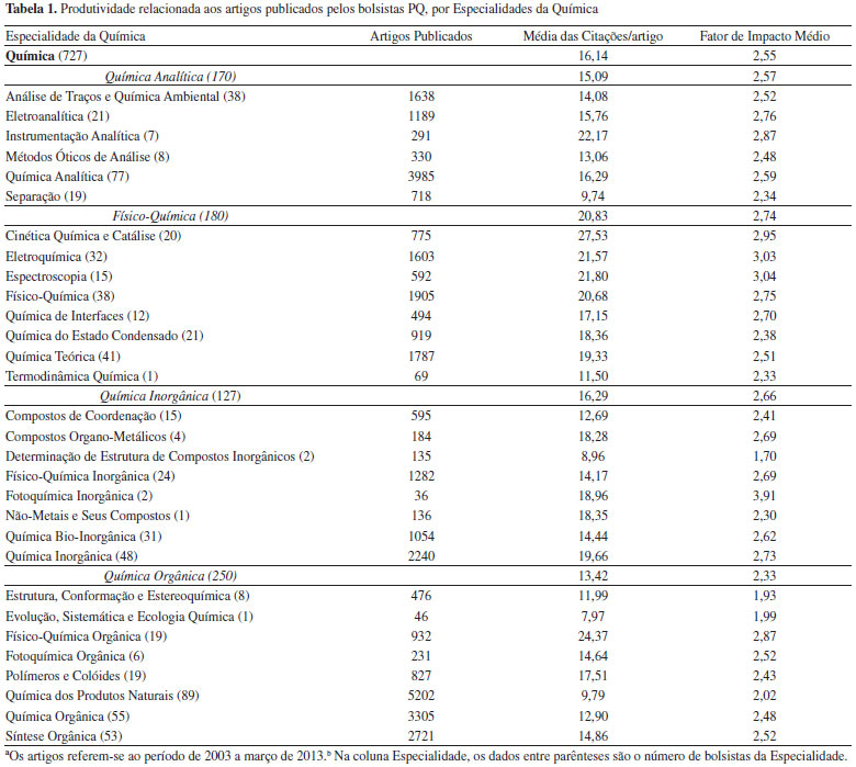 IConselho Nacional de Desenvolvimento Científico e Tecnológico, SHIS QI 01, Conjunto B, Bloco C, Lago Sul, 71605-001 Brasília - DF, Brasil Recebido em 26/10/2015 *e-mail: lucilene.candido@cnpq.br The profile analysis of CNPq Research Productivity Fellows (PQ) in the four subfields of chemistry and in their respective specialties highlighted particularities with regard to the indicators related to the judging criteria established by the Chemistry Advisory Committee. The curricula of all 727 PQ fellows with active grants in 15/03/2013 were analyzed spanning the past10 years (2003-2013). Out of all PQ-1 fellows, researchers in the subfield of Organic Chemistry had the highest median number of articles published per year. The subfield of Analytical Chemistry qualifies a higher number of postgraduate level students in comparison to other Chemistry subfields. Furthermore, this subfield had the highest average Hirsch index among PQ-1A and PQ-1B fellows. On the other hand, Inorganic Chemistry had the highest average number of patent applications per researcher, while Physical Chemistry had the specialties with the highest citation rates per paper and the highest average impact factors per journal. In all subfields, women made up a low proportion, especially at the highest levels of PQ fellowships. Although quantitative differences in scientific output were observed among the subfields, qualitative evaluation of science output was not carried out. INTRODUÇÃO As primeiras bolsas de Produtividade em Pesquisa (PQ) do Conselho Nacional de Desenvolvimento Científico e Tecnológico (CNPq), na área de Química, foram concedidas em 1976 com o intuito de valorizar a produtividade científica dos pesquisadores frente a seus pares. Esta é uma modalidade de bolsa do CNPq que confere um status aos pesquisadores produtivos, refletindo em impacto positivo na vida acadêmica do pesquisador e da instituição ao qual o mesmo está vinculado. Esta modalidade de bolsa é hierarquizada em seis níveis (PQ-SR, PQ-1A, PQ-1B, PQ-1C, PQ-1D e PQ-2). Todos os níveis de bolsa PQ são recomendados pelo Comitê Assessor de Química. A bolsa PQ-SR tem o diferencial de ser concedida pelo Conselho Deliberativo do CNPq, ao pesquisador que se manteve ativo nos níveis PQ-1A ou PQ-1B por, no mínimo, 15 anos. A literatura reporta alguns poucos estudos sobre o perfil dos bolsistas de Produtividade Científica (PQ) do CNPq, apesar do grande interesse da comunidade científica por esta modalidade de bolsa. Um primeiro estudo sobre o perfil dos bolsistas de Produtividade em Pesquisa (PQ) da área de Química do CNPq foi publicado em 2010 por Santos et al.1 Em outro estudo,2 Alves et al. fizeram uma reavaliação do perfil dos bolsistas PQ do CNPq, da área de Química no Brasil, de acordo com as informações contidas na Plataforma Lattes. Foi considerada a produção científica de 695 bolsistas em 10 anos (2002 a 2011), utilizando uma linguagem automática de extração dos dados que foi desenvolvida pelos autores. Estes dois artigos são os únicos estudos existentes até o momento que avaliam a produtividade científica dos bolsistas PQ da Área de Química de forma objetiva, utilizando ferramentas bibliométricas ou cientométricas. Outra área do conhecimento, a Ciências da Saúde, também tem realizado estudos semelhantes a fim de promover o conhecimento do desenvolvimento científico obtido naquela área.3-7 O estudo de 20101 apresentou a produtividade individual dos bolsistas PQ e destacou que alguns indicadores objetivos e quantitativos de produtividade científica deveriam ser analisados com cautela, devido às especificidades das áreas do conhecimento. A partir desta idéia, o estudo atual se propõe avançar na avaliação do perfil de produtividade científica da Química, com uma abordagem que atente às peculiaridades das Subáreas e de suas Especialidades. De acordo com um trabalho preliminar, realizado pela Comissão Especial de Estudos constituída por representantes do CNPq, da CAPES e da FINEP,8 sobre a proposta de uma nova Tabela das Áreas do Conhecimento, entende-se por Subárea uma segmentação da área de conhecimento estabelecida em função do objeto de estudo e de procedimentos metodológicos reconhecidos e amplamente utilizados e por Especialidade entende-se a caracterização temática da atividade de pesquisa e de ensino. A área de Química no CNPq é dividida, conforme a Tabela de Áreas do Conhecimento, em quatro subáreas: Química Analítica, Físico-Química, Química Inorgânica e Química Orgânica. Cada uma dessas subáreas é subdividida em Especialidades do conhecimento, perfazendo um total de 29 Especialidades.9 Neste trabalho foi realizado um estudo do perfil de produtividade científica das subáreas da Química e de suas Especialidades, a partir dos indicadores de produtividade dos bolsistas de Produtividade em Pesquisa (PQ), extraídos dos currículos Lattes dos bolsistas PQ e referentes ao período de 10 anos (2003 até a captura dos dados em 15/03/2013).