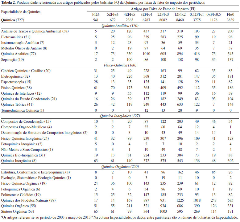 Na análise do número total de artigos publicados em 10 anos, verificou-se que a subárea de Química Orgânica foi a que mais publicou artigos, em números brutos. Entre as Especialidades, as mais produtivas foram a Química de Produtos Naturais e a "Especialidade"- Química Analítica. Na análise da repercussão da produção científica, como medida do número de citações dos artigos publicados pelos pesquisadores de cada Especialidade, em 10 anos, verificou-se que as Especialidades com maior número de citações recebidas foram a "Especialidade"- Química Analítica com 67369 citações e a Química de Produtos Naturais com 50615 citações. A penúltima coluna da Tabela 1 apresenta a média de citações/artigo, nas respectivas Especialidades e subáreas da Química. Os dados se referem à média da razão entre o número de citações recebidas e o número dos artigos publicados por pesquisador da Especialidade. As médias obtidas foram geradas a partir de uma análise de média por ANOVA com 1 fator (a=0,05). Nesta análise, verificou-se que todas as Especialidades possuíam média de citações/artigo consideradas estatisticamente semelhantes à média geral da Química, que era de 16,14 citações/artigo, exceto nas Especialidades Cinética Química e Catálise com média de 27,53 citações/artigo e na Química de Produtos Naturais com média de 9,79 citações/artigo, cujas médias eram, respectivamente, superior e inferior à média geral da Química. Em uma apreciação por subárea, verificou-se que a Especialidade da Química Analítica com o maior número de citações por artigo era a Instrumentação Analítica, com média de 22,7 citações/artigo. Na Físico-Química, a maior média era da Cinética Química e Catálise, na Química Inorgânica, a maior média era da Fotoquímica Inorgânica e na Química Orgânica, a maior média era da Físico-Química Orgânica. Fator de impacto por Especialidade da Química e categoria de bolsa O CA-QU incluiu, nos novos critérios que serão utilizados no triênio 2015-2017, como um dos indicadores de apoio para a apreciação do critério Produção do Pesquisador, o fator de impacto médio das publicações. Este indicador já era apreciado pelo CA-QU nos julgamento de bolsa PQ, desde 2009, a título de informação complementar sobre a produtividade do pesquisador. O fator de impacto médio representa a média aritmética dos valores de fator de impacto (FI) de cada um dos periódicos publicados. A Tabela 1 apresenta, na última coluna, a média do fator de impacto médio das publicações em cada Especialidade no período de 10 anos. O fator de impacto médio da área de Química no período de 2003 a 2013 era igual a 2,55. O maior valor médio entre as subáreas era da Físico-Química com 2,74 e o menor valor era da Química Orgânica com 2,33. Nesta análise verificou-se que a Especialidade que possuía o maior fator de impacto médio, entre as Especialidades da Química, era a Fotoquímica Inorgânica com o valor de 3,91 e o menor era da Determinação de Estrutura de Compostos Inorgânicos, com valor de 1,70. Também, verificou-se que nenhuma das Especialidades da Físico-Química ou da Química Analítica possuíam valores de fator de impacto médio inferiores a 2,3. Em análise do fator de impacto médio e os níveis de bolsa PQ (dados não mostrados) verificou-se que tanto para os níveis PQ-1A quanto para o PQ-2, a Físico-Química possuía os maiores valores (3,06) e (2,77), respectivamente. A Química Analítica tinha os maiores valores médios para os pesquisadores classificados nos níveis PQ-1B com 2,80, PQ-1C com 2,75 e PQ-SR com 2,71. A Química Inorgânica possuía o maior valor de fator de impacto médio no nível PQ-1D com 2,71. O fator de impacto das revistas é um indicador bastante controverso, visto que é baseado em citações das publicações. Sua utilização como medida da qualidade de um trabalho ou revista, por sua vez, também é bastante controversa. O fator de impacto dos periódicos, calculado pela Thomson Reuters e publicado anualmente como Relatório de Citação de Periódicos (JCR), foi criado originalmente como uma ferramenta para ajudar bilbiotecários a escolher periódicos que iriam adquirir, não como medida da qualidade científica da pesquisa em um artigo. Alguns autores17-19 afirmam que os dados utilizados para calcular o fator de impacto não são transparentes ou de livre acesso ao público e que o valor do fator de impacto publicado pela Thomson Reuters no Journal Citation Report não é reprodutível e por isso outras bases de dados deveriam ser utilizadas. Neste aspecto, Vanclay17 destacou que o fator de impacto tem várias limitações, tais como: a) a distribuição das citações em um periódico é bastante distorcida; b) depende enormemente da area de pesquisa, subárea e até Especialidade; c) é dado que pode ser manipulado por políticas editoriais; e d) os dados utilizados para calcular o fator de impacto não são transparentes ou de livre acesso ao público. Considerando as limitações do fator de impacto, muitos têm sido os manifestos contra o seu uso na avaliação científica de artigos, indivíduos e instituições.20-22 Apesar destas controvérsias, este é um índice utilizado nos julgamentos de bolsa PQ pelo Comitê Assessor de Química e por alguns outros Comitês de Assessoramento do CNPq. A Tabela 2 apresenta o número total de artigos publicados nas Especialidades da Química, por faixa de fator de impacto.