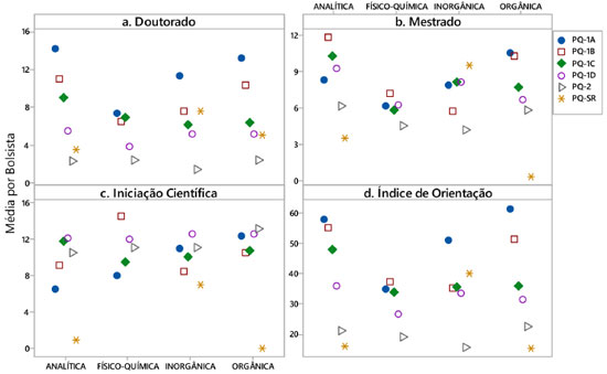 Os valores de índice m de Hirsch foram baseados nos índices H de pesquisadores norte-americanos da área de Física e esses tinham padrões de publicação e citação bem diferentes dos pesquisadores brasileiros da área de Química. Devido a esta questão, foi feita a apreciação do universo de valores de índice H dos pesquisadores da área de Química pela idade científica e registrada a reta de regressão, para a atribuição de um índice mais coerente com a realidade brasileira da área. Na análise de todos os bolsistas PQ do Programa Básico de Química, o valor de m obtido para a área de Química foi m= 0,62. Baseado neste índice, contextualizado à área de Química, verificou-se que 56% dos bolsistas PQ possuíam valores de índice m > 0,62 e, portanto, estavam acima da média em relação aos seus pares. Conforme as análises anteriores sobre o índice H, verificou-se que o índice m possuía valores diferentes para cada subárea. A Química Analítica era a subárea que possuía o maior valor com índice m=0,67 e a Química Orgânica era a que possuía o menor valor com índice m=0,58. O índice m não é utilizado pelo CA-QU nos julgamentos de bolsa PQ, mas guardados os devidos cuidados de análise e de fatores interferentes, é um indicador que pode revelar o ritmo de ascensão da produtividade científica de um pesquisador individual ou, em outro sentido, o grau de interesse produzido pela pesquisa desenvolvida. Dentre os bolsistas PQ da Química, apenas 5 possuíam índice m maior ou igual a 2,0, sendo que 2 bolsistas eram da categoria PQ-1A (1 da Físico-Química e 1 da Química Orgânica) e 3 da categoria PQ-2 (1 da Química Inorgânica, 1 da Química Analítica e 1 da Química Orgânica). Em março de 2009, o maior valor de índice m da Química era m=1,82 de um pesquisador PQ-1A da Físico-Química. Em março de 2013, este mesmo pesquisador possuía o terceiro maior valor deste índice com m=2,0 e o pesquisador com o maior valor de índice m era um bolsista PQ-2 da Química Inorgânica com índice m igual a 2,5. Em 2013, o universo de bolsistas PQ que possuíam índice m com valores entre 1,00 e 1,99 era de 135 pesquisadores, destes, 84 eram bolsistas PQ-2, 11 eram PQ-1A, 8 eram PQ-1B, 12 eram PQ-1C e 20 eram PQ-1D. Formação de recursos humanos Um outro critério estabelecido pelo CA-QU diz respeito à capacidade de formação de recursos humanos qualificados. Para tal critério, o CA-QU adota um cálculo chamado de índice de orientação (IO) que se baseia no número de orientações concluídas de Iniciação Científica, Mestrado e Doutorado. A Figura 6 apresenta as médias do número de orientações concluídas de Iniciação Científica, de Mestrado, de Doutorado e a média do índice de orientação (IO) obtidos em cada nível de bolsa PQ da subárea.