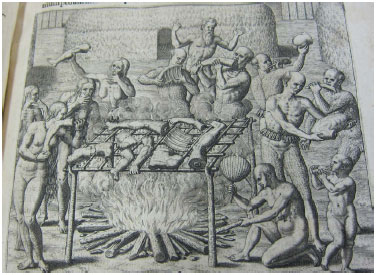![]() Figura 1. Gravura mostrando um ritual antropofágico entre os Tupinambá presenciado e descrito por Hans Staden. (Gravura de Theodor de Bry, 1593)