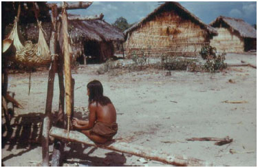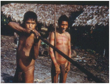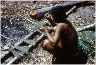 ![]() Figura 2. Homem Nukak (Makú) aplicando veneno (curare) nos dardos feitos das fibras duras e flexíveis da palmeira -pupunha. (Foto: H. Schultz, 1960, propriedade do autor)
