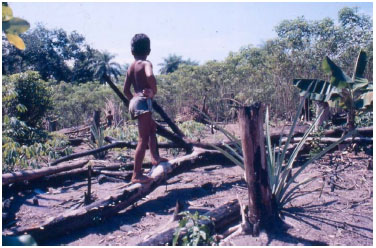 ![]() Figura 4. Numa típica roça amazonense apenas os arbustos e as árvores medianas sao derrubadas e queimadas antes da estaçao das chuvas. Nesta roça foram plantadas mandioca, café, abacaxi e bananas (Foto: K. Hilbert, Rio Trombetas 1992)