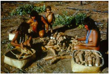 A farinha obtida pode ser conservada durante meses, e, para a ocasiao do consumo, é tostada e tem um ótimo gosto. Come-se farinha de mandioca em toda a Amazônia, acompanhada de peixe, carne ou hortaliças. Os outros subprodutos da mandioca sao usados em toda parte na culinária amazônica. Obtém-se o amido quando se deixa o sumo que resta da massa da mandioca parado até que o tucupi tenha se separado da goma, que decanta no fundo do recipiente. O tucupi, depois de ser fervido mais uma vez, é usado de diversas formas na cozinha amazônica. Ele é fortemente temperado com pimenta vermelha ou serve de substância básica para vários tipos de sopas e caldos, em que se cozinha peixe, crustáceo, frango ou carne de pato com muitos tipos de hortaliças e, naturalmente, é combinado com farinha de mandioca (Figura 8).