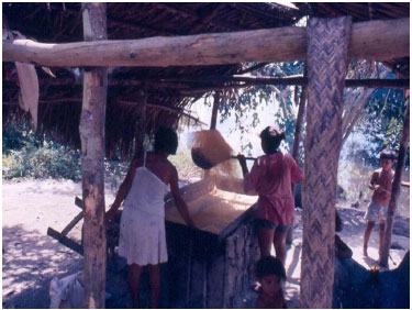 ![]() Figura 7. A farinha da mandioca é torrada, na casa de farinha, em grandes fornos de barro. A cabocla usa um remo velho e joga a farinha grossa com muita habilidade no ar, até que ela seja bem seca e crocante. No primeiro plano da imagem vê-se, pendurado de um dos caibros da casa, uma prensa telescópica, o tipiti. (Foto: K. Hilbert, Rio Trombetas 1992)