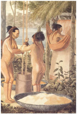 ![]() Figura 8. A aquarela de Hercule Florence, que participou como desenhista da expediçao G. I. von Langsdorff (1830). Representa um grupo de mulheres Apiaká pilando e peneirando farinha de mandioca