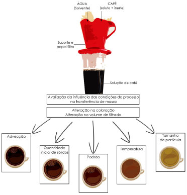 Experimento 1: efeito da contribuiçao advectiva Foram montados dois sistemas utilizando-se copo transparente, suporte e filtro. No primeiro sistema o café foi passado empregando-se duas medidas (40 g) de café moído, 200 mL de água quente (100 ºC, medida com um termômetro de mercúrio) e agitaçao promovida por uma colher. No segundo sistema foram utilizadas as mesmas condiçoes do primeiro, exceto a agitaçao pela colher. Entao, observou-se a coloraçao resultante em cada um dos sistemas. Experimento 2: avaliaçao da quantidade de café Os dois sistemas foram realizados como descrito no Experimento 1. No primeiro sistema foram adicionadas duas medidas (40 g) de café moído, enquanto no segundo sistema foram adicionadas quatro medidas (80 g) de café. Após, a cada um dos sistemas foram adicionados 200 mL de água quente (100 ºC) e, entao, observou-se a diferença de coloraçao resultante nos dois sistemas. Experimento 3: avaliaçao da temperatura Dois sistemas foram realizados como descrito anteriormente no Experimento 1. Em cada um dos sistemas foram adicionadas duas medidas (40 g) de café moído. Na sequência, um dos sistemas recebeu a adiçao de 200 mL de água fria (temperatura ambiente) enquanto o outro recebeu 200 mL de água quente (100 ºC). Observou-se a coloraçao resultante em cada um dos sistemas. Experimento 4: efeito do tamanho de partícula Foram realizados dois sistemas conforme descrito no Experimento 1. No primeiro sistema o café foi passado utilizando-se duas medidas (40 g) de café moído e 200 mL de água quente (100 ºC). No segundo sistema empregaram-se duas medidas (40 g) de café em graos e 200 mL de água quente (100 ºC). Entao, observou-se a coloraçao resultante em cada um dos sistemas.