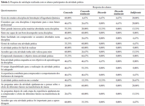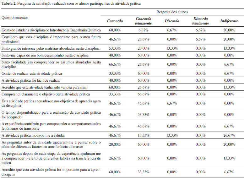 Como a amostra apresenta N ≤ 25, o valor de Tcrítico é obtido na tabela dos valores críticos de Wilcoxon. Observa-se, na Tabela 1, que Tcalculado < Tcrítico. Nesse caso, rejeita-se a hipótese de que as médias sao iguais (H0) utilizando α = 5%. Ou seja, há diferença entre as médias de acertos obtidas para o pré-teste e o pós-teste e, como a média de acertos do pós-teste foi maior do que a do pré-teste, pode-se inferir que a aprendizagem dos alunos foi significativamente maior após a realizaçao do experimento em sala de aula. Logo, a metodologia didática proposta e aplicada neste trabalho possibilitou uma melhora efetiva no processo de ensino-aprendizagem dos alunos da disciplina de Introduçao à Engenharia Química. Embora esta metodologia didática tenha sido aplicada na disciplina de Introduçao à Engenharia Química de uma instituiçao pública, cabe salientar que esta nao é restrita a este curso e instituiçao, podendo ser aplicada em outros cursos de ensino superior e em outras instituiçoes. Um outro exemplo de aplicaçao, descrito por Andreatta-da-Costa,23 foi no curso de Engenharia Civil. Percepçao dos alunos A Tabela 2 apresenta as respostas dos alunos para a pesquisa de satisfaçao, que foi aplicada após a realizaçao da atividade prática em sala de aula. Dos 25 alunos participantes, 15 responderam à pesquisa (60%). Para que se pudesse conhecer os alunos da disciplina de Introduçao à Engenharia Química, visando um melhor entendimento das respostas destes quanto à atividade prática realizada, a pesquisa iniciou com alguns questionamentos sobre a disciplina.