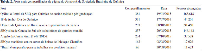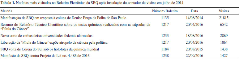 AVANÇOS E DESAFIOS Ao longo de toda a sua trajetória, o Boletim Eletrônico da SBQ tornou-se uma presença permanente e uma referência para os químicos do país, principalmente para aqueles ligados ao meio acadêmico, e também para estudantes de química e de ciências correlatas, estudantes do ensino médio, profissionais da área e pessoas com interesse geral por química e assuntos relacionados, sem necessariamente envolvimento profissional. O maior veículo de comunicaçao da SBQ passou por diversas transformaçoes ao longo dos anos e, cada um dos seus editores enfrentou, à sua forma, o desafio de realizar um trabalho competente, sério e dedicado, à custa de muito esforço pessoal. Com alteraçoes de forma, conteúdo e estilo, os nomes desses editores passaram a ser familiares aos leitores do Boletim, por integrarem o cotidiano das notícias da SBQ no decorrer dos últimos 35 anos. Na sua origem o Boletim teve um papel fundamental na integraçao nacional entre os químicos (que se distribuíam rapidamente por um número crescente de estados e municípios do país) e no fortalecimento das revistas científicas da Sociedade, que vieram a ter forte e fundamental importância na consolidaçao da pós-graduaçao e da ciência química no Brasil. Na época de sua criaçao, no biênio 83/84, eram 24 os cursos de pós-graduaçao em química no país, que formaram 599 mestres e 276 doutores, números que cresceriam substancialmente até atingir 61 programas em 2014, com a formaçao de 1064 mestres e 579 doutores.2 Na sua criaçao, o Boletim era a principal fonte de comunicaçao da Diretoria e Conselho da SBQ com o associado, em uma época em que endereços e-mails, websites, redes sociais e postagens digitais eram invençoes extraordinárias demais para serem pressagiadas. Nas suas primeiras décadas de existência o Boletim, com a publicaçao de artigos de opiniao e de análises reflexivas de associados SBQ, contribuiu também para a estruturaçao, amadurecimento e fortalecimento deste "ser coletivo"3 tao almejado pelos fundadores da Sociedade. Já com a ampliaçao do seu público alvo para nao associados, a publicaçao assumiu também um papel mais geral de acompanhamento e divulgaçao dos fatos relevantes sobre todas as políticas de ciência, educaçao, tecnologia e inovaçao no país nas áreas de interesse da Sociedade. Além de permanecer alerta sobre todos esses tópicos, nos dias de hoje a publicaçao ainda preza por divulgar fielmente, assim como desde o seu início, todos os novos números das revistas da Sociedade, o Journal of the Brazilian Chemical Society, a Química Nova, a Química Nova na Escola e a Revista Virtual de Química, e impulsionar a propagaçao dos trabalhos relatados nessas ediçoes. O reconhecimento nacional e internacional da ciência desenvolvida pelos químicos do país, com destaque para seus associados, é frequentemente comemorado em suas ediçoes, através da publicaçao de seus prêmios, cargos de destaque, títulos de relevância. O Boletim também sempre deu voz a manifestaçoes, a cada vez que um fato grave veio atingir as políticas nacionais de educaçao, a ciência de forma geral, e a química em particular. E nao há dúvida de que, em todos estes anos de existência da SBQ, estas áreas enfrentaram no Brasil situaçoes que foram (e ainda sao), ao mesmo tempo, grandes ataques e desafiadores incentivos de todas as naturezas. Assim como nos seus primórdios, o BE continua também a desempenhar também o papel básico de prestador de serviços, publicando semanalmente informes sobre os mais variados eventos da área no país, concursos e empregos, assim como oportunidades nacionais e internacionais para prêmios, dentre outras divulgaçoes. A instalaçao de um contador de visitas nas matérias do Boletim a partir do número 1132 (31 de julho de 2014), assim como o uso das ferramentas estatísticas do Facebook, permite atualmente ao editor avaliar as notícias que mais impactam o leitor e isso poderá talvez nortear, se necessário, possíveis modificaçoes em sua linha editorial no futuro. As notícias sobre a divulgaçao dos números novos das revistas e obras publicadas pela Sociedade sao muito compartilhadas pelos leitores e autores, ressaltando o grande impacto da PubliSBQ4 no fortalecimento da educaçao química e pós-graduaçao no país. A defesa da ciência através de manifestos e cartas publicados por membros de sua Diretoria e/ou Conselho continuam sendo muito bem recebidos, o que talvez traduza a vontade dos químicos de todas as geraçoes de que a SBQ continue a ser a voz firme e atuante que sempre defendeu interesses gerais e urgentes da comunidade. Intervençoes de reconhecidos pesquisadores químicos na grande mídia, sobre assuntos polêmicos que atingem diretamente a populaçao de forma geral, também têm grande impacto na sociedade e precisam ser urgentemente incentivadas pela SBQ. Algumas das notícias de maior impacto, publicadas a partir da instalaçao do contador de visitas em 2014 nas páginas do Boletim Eletrônico, bem como algumas das notícias mais compartilhadas no Facebook, dentro deste contexto, sao apresentadas nas Tabelas 1 e 2, respectivamente.