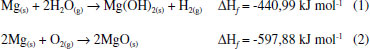 Os flares convencionais compreendem a maior parte desse tipo de contramedida em poder das forças aéreas ao redor do mundo. Isso ocorre em virtude do baixo custo de aquisiçao e da boa confiabilidade dentro de alguns cenários específicos.1 Outras características inerentes a essa composiçao sao: uma alta densidade de energia liberada durante a combustao, ocasionando a produçao de luz e calor necessários;8 um relativo grau de segurança durante o manuseio e a fabricaçao da mistura, ocasionado pela alta temperatura de autoigniçao do material (530 °C);9 e uma boa compatibilidade química entre as espécies componentes, o que corresponde à ausência de eventuais interaçoes químicas e físicas com potencial para ocasionar perda de desempenho e diminuiçao na segurança do manuseio e de estocagem desse material.7 Uma vez que o Brasil é um país de dimensoes continentais, condiçoes adversas (altas temperaturas e umidades relativas, além da exposiçao à radiaçao solar, dentre outros) experimentadas durante a estocagem ou o transporte do material entre as localidades podem comprometer o material ao ponto de nao garantir o correto desempenho para o qual os flares foram projetados e a operaçao segura durante seu manuseio e aplicaçao.10,11 Assim, torna-se importante determinar de que forma os fatores relacionados às condiçoes de estocagem e aos métodos de transporte podem afetar as propriedades físicas e químicas desse tipo de material.12 A degradaçao das propriedades físicas e químicas de uma composiçao magnésio/PTFE/FPM decorre da combinaçao entre três fatores: período de exposiçao, temperatura e umidade, sendo este o elemento mais significativo no evento.13 No caso desses flares, seu processo de envelhecimento é caracterizado pela tendência do magnésio em sofrer reaçoes de oxidaçao quando em contato com a umidade e com o oxigênio presente no ar.14 Uma unidade de flare convencional é composta por um estojo de alumínio com tampas plásticas nas extremidades. A composiçao utilizada é envolvida por um revestimento adesivo reforçado e acondicionada no interior do estojo, que possuirá um formato cilíndrico ou de um bloco retangular, de acordo com o modelo do flare. Durante a colocaçao do mesmo na aeronave, uma das tampas plásticas será substituída por um cartucho ignitor. A separaçao entre esse cartucho e a carga de magnésio/PTFE/FPM é feita por uma peça plástica que contém um orifício. A chama produzida pela iniciaçao do cartucho irá se propagar por esse orifício a fim de sensibilizar a composiçao e provocar a sua ejeçao da aeronave. Essas contramedidas serao suscetíveis ao envelhecimento, uma vez que o orifício da passagem da chama de igniçao da carga de magnésio/PTFE/FPM permitirá, também, a entrada de umidade durante o período de estocagem. Essa umidade irá reagir com o magnésio da composiçao, promovendo o seu processo de degradaçao. As reaçoes de oxidaçao dos flares geram como produtos o gás hidrogênio (H2), o hidróxido de magnésio (Mg(OH)2) e o óxido de magnésio (MgO),13 conforme as Equaçoes (1) e (2). ![]() A formaçao do hidróxido de magnésio e do óxido de magnésio ocasiona uma diminuiçao da capacidade de igniçao do material e da produçao de calor, uma vez que restringem a quantidade de magnésio livre na composiçao.14 O eventual acúmulo de gás hidrogênio (ainda que em um determinado período de tempo) no interior das embalagens de armazenamento, em níveis acima do limite inferior de inflamabilidade, ocasiona o comprometimento da segurança das instalaçoes e de eventual pessoal envolvido durante o manuseio e/ou transporte.15 As tendências atuais relacionadas à proteçao da composiçao magnésio/PTFE/FPM contra o processo de envelhecimento compreendem: a investigaçao sobre a viabilidade da substituiçao dos fluorocarbonos utilizados na funçao de aglutinantes, como o FPM, por outros tipos de compostos, como aqueles à base de silano (SiH4) com o objetivo de eliminar a possibilidade de liberaçao de ácido fluorídrico (HF), além da utilizaçao de ligas de magnésio que sejam menos propensas a sofrer reaçoes de oxidaçao quando submetidas a eventuais condiçoes de temperatura e umidades elevadas durante o período de armazenamento.5 O envelhecimento de flares convencionais ocasiona o comprometimento da segurança durante o seu manuseio, bem como do desempenho esperado quando em uma eventual utilizaçao. Apesar disso, em virtude da aplicaçao militar que esses dispositivos possuem, nao há trabalhos disponíveis na literatura aberta em que tenha sido realizado o estudo dos efeitos do envelhecimento com a utilizaçao de flares operacionais e nas mesmas condiçoes de armazenamento, sendo este o objetivo do presente trabalho.