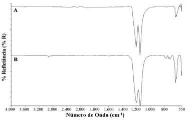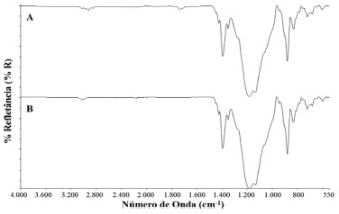 ![]() Figura 3. Espectros da amostra do material nao envelhecido (parte solúvel, espectro A) e de referência do copolímero de fluoreto de vinilideno e hexa fluorpropileno (espectro B)