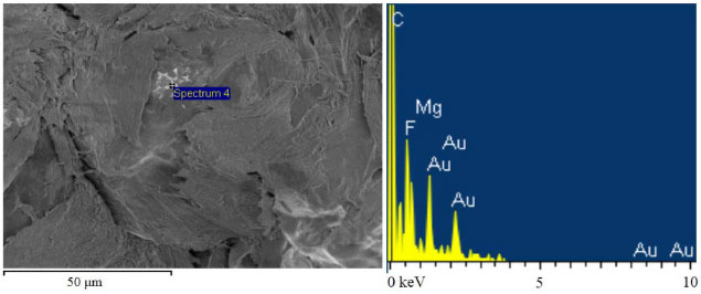 No espectro A, as absorçoes verificadas em, aproximadamente, 1200 cm-1, 1150 cm-1 e 680 cm-1, caracterizam a ligaçao C-F24 e indicam a presença do PTFE, conforme o trabalho de Koch.25 Microscópio Eletrônico de Varredura e Espectroscopia por Energia Dispersiva de Raios-X A Figura 5 apresenta a fotomicrografia de uma amostra de referência, com ampliaçao de 3.500 vezes (esquerda), e o espectro EDS da área correspondente ao quadrado referenciado como Spectrum 4 (direita).
