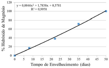 ![]() Figura 6. Porcentagem de hidróxido de magnésio em funçao do tempo de envelhecimento na câmara climática, em dias