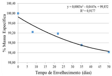![]() Figura 7. Percentual da massa específica em funçao do tempo de envelheci mento na câmara climática, em dias