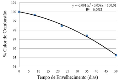 ![]() Figura 8. Percentual do calor de combustao em funçao do tempo de envelhe cimento na câmara climática, em dias