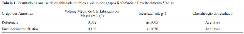 Para ambos os grupos analisados, observa-se que as condiçoes de temperatura e de umidade relativa às quais o material esteve exposto durante cinquenta dias nao foram suficientes para ocasionar o comprometimento da sua funcionalidade e segurança durante eventual armazenamento e manuseio. Em virtude dos resultados, nao foram realizadas as análises dos grupos referentes aos níveis intermediários de envelhecimento.