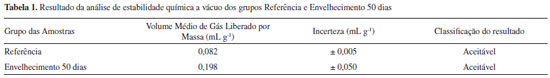 Verifica-se uma tendência de diminuiçao dos valores em funçao do tempo de envelhecimento (em dias), o que possui uma relaçao direta com a formaçao do hidróxido de magnésio, de maneira que houve uma queda de aproximadamente 5%, quando considerados os valores de referência e os relativos ao grupo Envelhecimento 50 dias. A literatura indica que, durante a formaçao dessa substância, ocorre a sua deposiçao, em camadas, sobre as partículas de magnésio, ocasionando a passivaçao do metal e, consequentemente, uma menor liberaçao de calor durante o processo de combustao, levando a uma diminuiçao da velocidade da queima.27 Estabilidade química a vácuo Os ensaios consistiram na exposiçao de amostras, com massas de 5,00 g ± 0,01 g, a uma temperatura de 100 °C ± 0,01 °C por um período de quarenta horas, em conformidade com a norma STANAG 4556 (Vacuum Stability Test).28 Os resultados médios das análises, realizadas em triplicata para cada grupo de amostras, podem ser verificados na Tabela 1, bem como as respectivas incertezas-padrao associadas ao processo de mediçao, com um nível de confiabilidade de 95%. Na coluna da direita, sao apresentadas as respectivas classificaçoes do resultado, baseadas no método US/202.01.001 da norma AOP-7 (Manual of Data Requirements and Tests for the Qualification of Explosive Materials for Military Use), da Organizaçao do Tratado do Atlântico Norte (OTAN).29 Esse método, elaborado pelos EUA, regula a aplicaçao do teste de estabilidade a vácuo em composiçoes pirotécnicas, estabelecendo como critério de aceitaçao um volume de gás liberado por massa menor do que 2 mL g-1 durante o período de duraçao do teste.