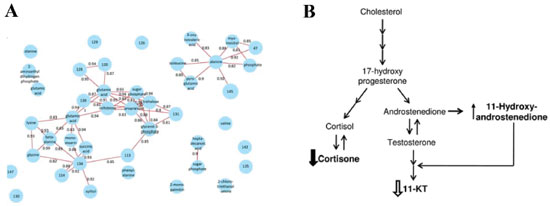 Figura 2. Exemplos de estudo em metabolômica ambiental. A) Análise de correlação de 43 metabólitos significativos de células de Pseudomonas putida expostas a propranolol. Reproduzido da referência 87 com permissão da The Royal Society of Chemistry. B) Alterações metabólicas na esteroidogênese de Rutilus rutilus causadas pelo pesticida fenotrotion. Reproduzido da referência 88 com permissão da ACS