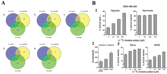 Figura 3. Exemplos de estudo em metabolômica clínica. A) Entidades discriminantes entre os diferentes grupos de indivíduos para estudo da ação de antirretrovirais em pacientes com HIV, em amostras de bactérias intestinais analisadas por (a) LC-MS modo positivo, (b) LC-MS modo negativo, e (c) CE-MS modo positivo; e amostras de plasma, analisadas por (d) LC-MS modo positivo, e (e) LC-MS modo negativo. Reproduzido da referência 112 com permissão da Elsevier. B) Porcentagem aumentada de acetil-CoA marcado com C13 na avaliação da proliferação de células cancerígenas. (1) célula normal em condição de hipóxia e rica em oxigênio (normoxia), com adição em concentrações crescentes de acetato marcado em meio contendo glicose e glutamina marcada; (2) quantificação de acetato em meio de cultura sem soro e em soro dialisado (controle); (3) células cancerígenas em condição de hipóxia, com adição em concentrações crescentes de acetato marcado. Reproduzido da referência 113 com permissão da BioMed Central