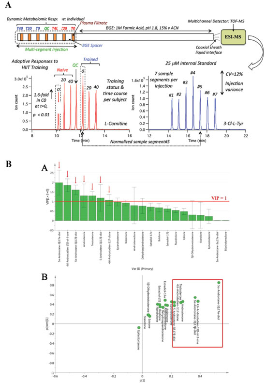 Figura 4. Exemplos de estudo em metabolômica no esporte. A) Apresentação de esquema de injeção sequencial de sete amostras em CE-MS para análise em única medida de separação e respectivos eletroferogramas extraídos de L-cartinina (vermelho) e padrão interno (azul) do estudo metabolômico da análise de plasma de mulheres submetidas a exercícios físicos de alta intensidade. Reproduzido da referência 134 com permissão da John Wiley and Sons. B) Resultados de (A) VIP score e (B) S-plot construído de modelos OPLS-DA, com destaque nos sete esteroides considerados potenciais biomarcadores para análise anti-doping em cavalos de corrida. Reproduzido da referência 135 com permissão da ACS