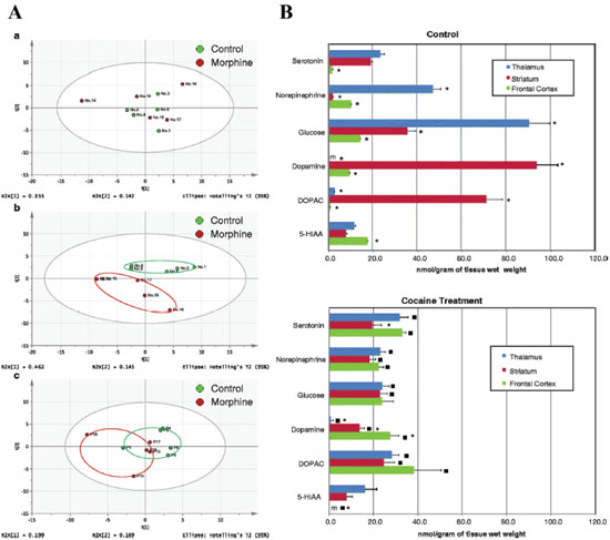 Figura 9. Exemplos de estudo em metabolômica em toxicologia forense. A) Gráfico de scores de modelo PCA de amostras de urina e plasma de ratos dos grupos controle (verde) e tratado com 4 mg/kg morfina (vermelho). (a) amostras de urina coletadas antes da administração de morfina; (b) amostras de urina coletadas após o tratamento (e dependência) de morfina; (c) amostras de plasma coletadas após o tratamento (e dependência) de morfina. Reproduzido da referência 275 com permissão da Springer. B) Concentrações de neurotransmissores e metabólitos (em nmol/g) em diferentes regiões do cérebro de ratos não tratados e tratados com cocaína. As diferenças estatisticamente significativas (intervalo de confiança de 95%) são representadas da seguinte forma: o único asterisco indica diferenças para uma substância determinada entre as três áreas anatômicas; os quadrados indicam diferenças entre os grupos tratados e não tratados com cocaína; (m) indica valores abaixo do limite de detecção. Reproduzido da referência 276 com permissão da Springer