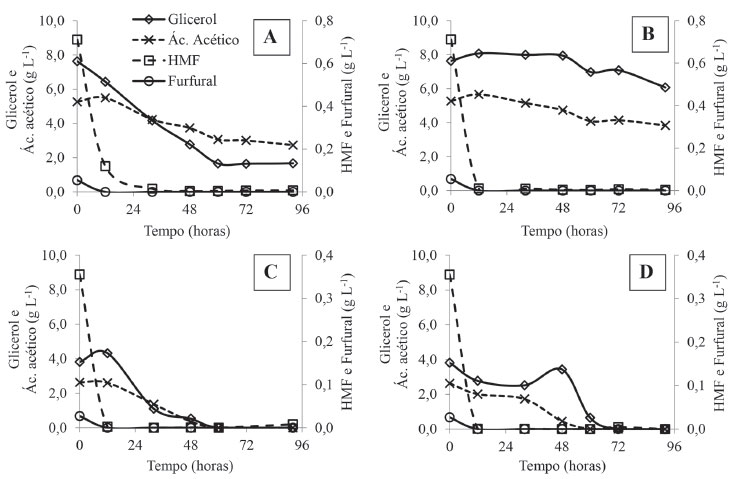 A fração solúvel recuperada após o tratamento ácido da torta de girassol continha 38 g L-1 de açúcares redutores, mais da metade deles, 19,5 g L-1, constituído por xilose (Tabela 2). Além da xilose, foram encontrados 8,8 g L-1 de arabinose e 7,6 g L-1 de glicose no hidrolisado. Outro componente presente em concentrações elevadas no hidrolisado hemicelulósico foi o glicerol (Tabela 2). Provavelmente, este glicerol se originou da hidrólise de triglicerídeos ainda presentes na torta de girassol mesmo após a prensagem das sementes para extração do óleo. Embora o principal objetivo do tratamento ácido de biomassas lignocelulósicas seja a remoção da hemicelulose para favorecimento da sacarificação enzimática da celulose, este mesmo tratamento envolve frequentemente reações secundárias, que resultam em subprodutos derivados da hidrólise de grupos acetila presentes na hemicelulose e da desidratação de monossacarídeos, gerando o ácido acético, o furfural e o 5-hidroximetilfurfural como principais produtos.49 Todos esses subprodutos podem levar à inibição de processos bioquímicos a jusante. No presente estudo a concentração dos inibidores pesquisados, ácido acético (5,27 g L-1), furfural (0,05 g L-1) e 5-hidroximetilfurfural (0,71 g L-1) (Tabela 2), foram distintos dos valores relatados na literatura para hidrolisados hemicelulósicos de farelo de girassol tratados com H2SO4. Em estudos com hidrolisado de farelo de girassol, Tavares et al.50 observaram valores de 0,03 g L-1 de furfural e 0,03 g L-1 de HMF, enquanto Antonopoulou et al.39 encontraram valores de 0,04 g L-1 e 0,36 g L-1, respectivamente. Quanto ao ácido acético, Tavares et al.50 e Antonopoulou et al.39 relataram valores de 3,56 g L-1 e 0,85 g L-1, respectivamente, no hidrolisado ácido de farelo de girassol. De acordo com Gonzales et al.,51 a concentração máxima de inibidores que um micro-organismo suporta pode variar, pois depende do tipo de micro-organismo utilizado, da sua adaptação ao meio, do tipo de processo fermentativo empregado e ainda do efeito sinérgico de todos os inibidores presentes na solução. Dentre os inibidores encontrados no hidrolisado de torta de girassol aqui estudado, o furfural e o HMF podem ser considerados os mais danosos para os micro-organismos. Ambos podem causar rompimento da membrana celular e interferir no metabolismo intracelular.52 Todavia, de acordo com Behera et al.,53 o furfural apresenta efeitos mais acentuados se comparado a ação tóxica do HMF. O furfural inibe as enzimas do catabolismo primário do carbono, tais como as hexoquinases, as aldolases e a triosefosfato desidrogenase. Contudo, esses dois furanos têm ação inibitória sobre outras enzimas, como aquelas importantes na conversão dos açúcares a etanol, como a piruvato desidrogenase e a aldeído desidrogenase.52 Estes compostos podem, ainda, interferir em atividades moleculares causando redução na disponibilidade de NADH e ATP, bem como causar relaxamento e quebra de DNA.54 Os ácidos acético, fórmico e levulínico também podem afetar a membrana celular microbiana e diminuir o pH interno, aumentando a pressão de turgor e, por consequência, causando a lise celular.55 Fermentação alcoólica do hidrolisado hemicelulósico Alguns dos inibidores presentes no hidrolisado hemicelulósico foram completamente consumidos ou biotransformados ao longo do processo fermentativo pelas leveduras estudadas (Figura 1). G. geotrichum UFVJM-R10 e C. akabanensis UFVJM-R131 foram capazes de consumir completamente o ácido acético presente no hidrolisado suplementado (Figura 1C e 1D). Entretanto, no hidrolisado não suplementado o ácido acético foi consumido parcialmente e mais lentamente que no meio suplementado (Figura 1A e 1B). Cabe destacar que o meio suplementado recebeu adição de volume correspondente a 50% do volume final na forma de solução de macro e micronutrientes. Esta suplementação implicou na diluição dos inibidores presentes no hidrolisado como pode ser notado no tempo zero dos gráficos ilustrados nas Figuras 1C e 1D. O furfural foi consumido por ambos os micro-organismos nas primeiras 12 horas de fermentação nos meios sem suplementação e com suplementação (Figura 1). O HMF foi consumido pelas duas espécies de leveduras em no máximo 36 horas após o início da fermentação nas condições sem e com suplementação (Figura 1).