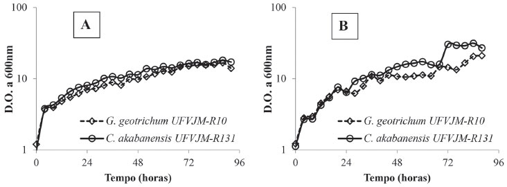 Figura 2. Perfil do crescimento celular baseado na leitura direta da densidade óptica (D.O600nm) das linhagens Galactomyces geotrichum UFVJM-R10 e Candida akabanensis UFVJM-R131 durante a fermentação do hidrolisado hemicelulósico da torta de girassol não suplementado (A) e suplementado (B)