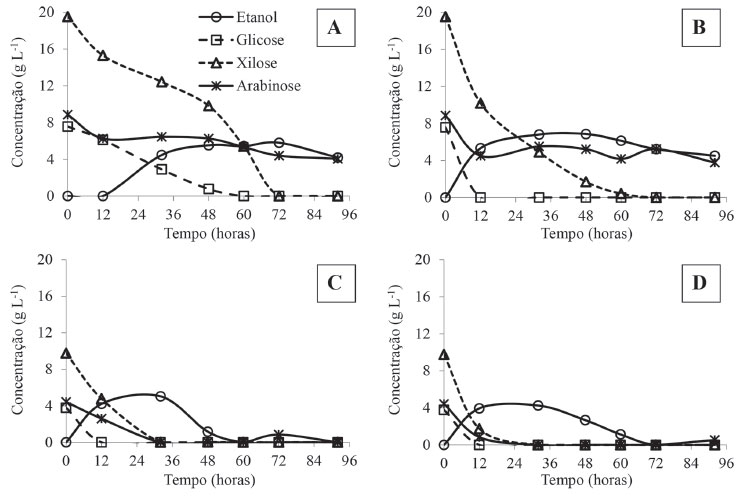 O perfil do consumo dos monossacarídeos presentes no hidrolisado está representado na Figura 3. A glicose foi totalmente consumida nas primeiras 12 horas pelo G. geotrichum UFVJM-R10 e C. akabanensis UFVJM-R131, nos meios suplementados (Figura 3C e 3D). No meio não suplementado, apenas a C. akabanensis UFVJM-R131 foi capaz de consumir a glicose nas 12 primeiras horas (Figura 3B). O perfil de consumo da glicose por G. geotrichum UFVJM-R10 no meio não suplementado foi semelhante ao do consumo da xilose, e foi concluído com 60 horas (Figura 3A). No meio isento de suplementação (Figura 3A e 3B), os micro-organismos consumiram apenas cerca de 40% da arabinose em 92 horas. A suplementação do hidrolisado com fontes de nitrogênio e minerais provavelmente contribuiu para a aceleração do metabolismo das duas leveduras avaliadas de forma que nesta condição a glicose, xilose e arabinose foram totalmente esgotadas em apenas 32 horas e com taxas de consumo semelhantes (Figura 3C e 3D). Entretanto, não se pode desprezar a contribuição do efeito diluente da solução de macro e microelementos que foi adicionada ao hidrolisado para constituição do meio suplementado. Tal diluição reduziu à metade a concentração dos prováveis inibidores e, por isso, pode ter favorecido também o metabolismo dos carboidratos.