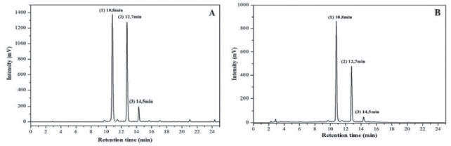 ![]() Figure 1. Chromatographic profile of the ethanol extract (A) and the aqueous extract (B) from B. pulchella. Mobile phase: MeOH-H2O/AcOH (0.2%), gradient, flow 1 mL min-1, λ = 330 nm, column C18, 1 (myricitrin), 2 (quercitrin) and 3 (afzelin)