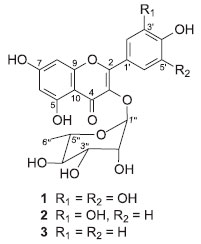 Fractionation of aqueous extract resulted in the isolation of flavonol glycosides: myricetin-3-O-α-L-rhamnoside (myricitrin, 1), quercetin-3-O-α-L-rhamnoside (quercitrin, 2) andkaempferol-3-O-α-L-rhamnoside (afzelin, 3) (Figure 2). The structures of these compounds were identified by analysis of 1D and 2D NMR spectra (Figure 3S-14S).
