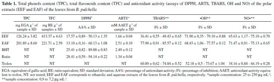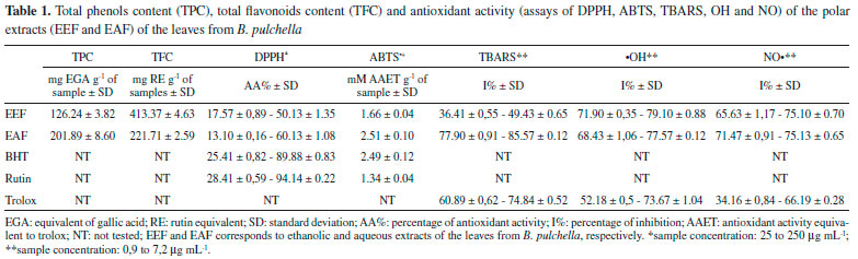 CONCLUSIONS The ethanolic and aqueous extracts of the B. pulchella leaves showed similar profiles in HPLC, with the presence of three flavonoids, myricitrin (1), quercitrin (2) andafzelin (3). The extracts showed positive correlation between TPC and antioxidant activity (DPPH, ABTS and TBARS). The antioxidant activity of ethanolic and aqueous extracts must be due to the presence of flavonoids 1-3. All extracts were inactive in the cytotoxicity MTT assay against lines OVCAR (ovaria), SF-295 (gliosblastoma) and HCT-116 (colon). In short, the polar extracts from the leaves of B. pulchella haveproved to be promising sources of phenolic biomolecules, with antioxidant potential, which may in the future be used as chemical markers for specie and validation of therapeutic use.